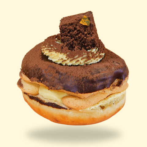 Indulge in a luxurious bite of Italy with Gilded Tiramisu Dream. This donut layers rich dark chocolate, velvety eggy mascarpone, and classic lady finger crumbles for a true tiramisu experience. Finished with a dusting of cacao powder, a decadent brownie cube, and a touch of edible gold leaf, it’s elegance and decadence in every dreamy mouthful.